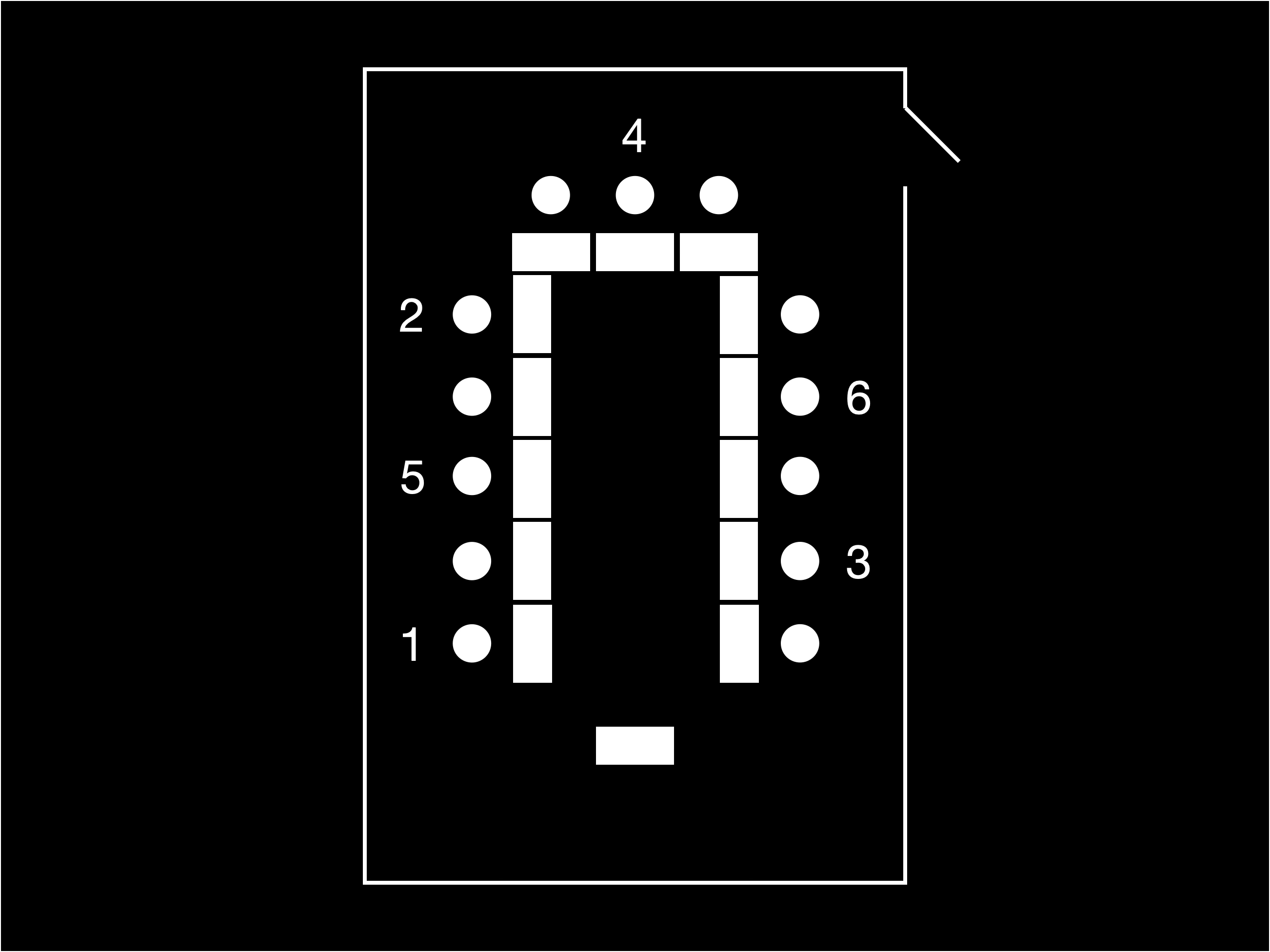 Ähnliches lässt sich in Seminarräumen beobachten, wenn sich die Teilnehmerinnen und Teilnehmer nicht kennen. Der Seminarraum ist noch leer. Es ist ein größerer Raum mit 12 bis 15 Plätzen zu einem offenen U angeordnet. Vorn der Referententisch. Die erste Teilnehmerin betritt den Raum. Welchen Platz wird sie nehmen? Wahrscheinlich einen fast am Ende eines der Enden des Us, weit weg von der Tür, und zwar so, dass sie die Tür im Blick hat. Der zweite Teilnehmer betritt den Raum, sagt vielleicht „Hallo“ und sucht sich einen Platz weit weg von der ersten Person, aber immer noch so, dass er ggf. die Tür im Blick hat. Die weiteren Personen folgen in gewisser Weise diesem Muster — sie positionieren sich in größeren Abständen voneinander, auch wenn sie den „Nachteil“ in Kauf nehmen müssen, die Tür vielleicht im Rücken zu haben. Die folgende Abbildung zeigt ein mögliches Muster der ersten Platzwahlen in einem Seminarraum.