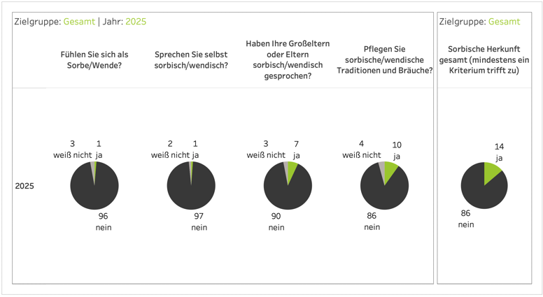 Die Frage, ob die eigenen Eltern oder Großeltern Sorbisch gesprochen haben, beantworten sieben Prozent der Lausitzer Bevölkerung mit „Ja“. Fragt man hingegen, wer selbst Sorbisch spricht, antworten in unserer Befragung seit Jahren zwischen einem und drei Prozent der Befragten mit „Ja“. (Bei so kleinen Gruppen gibt es bei 1000 Befragten natürlich eine gewisse Schwankungsbreite.) Fragt man, wer sich als Sorbe oder Wende fühlt, erhält man nur von einem Prozent der Befragten eine positive Antwort. Fragt man hingegen, wer sorbische Traditionen pflegt, stimmen zehn Prozent der Befragten zu. Kombiniert man alle Angaben — hat man also mindestens eins dieser vier Kriterien bejaht (Eltern oder Großeltern haben Sorbisch gesprochen; man spricht selbst Sorbisch; man identifiziert sich selbst als Sorbe; man pflegt sorbische Traditionen) — kommt man auf 14 Prozent der Lausitzer Bevölkerung, die das aufweisen, was wir hier etwas verallgemeinernd als „Nähe zum Sorbischen“ bezeichnen wollen. Mit dieser Nähe kann Sprache, Identität, Kultur oder Brauchtumspflege gemeint sein.
