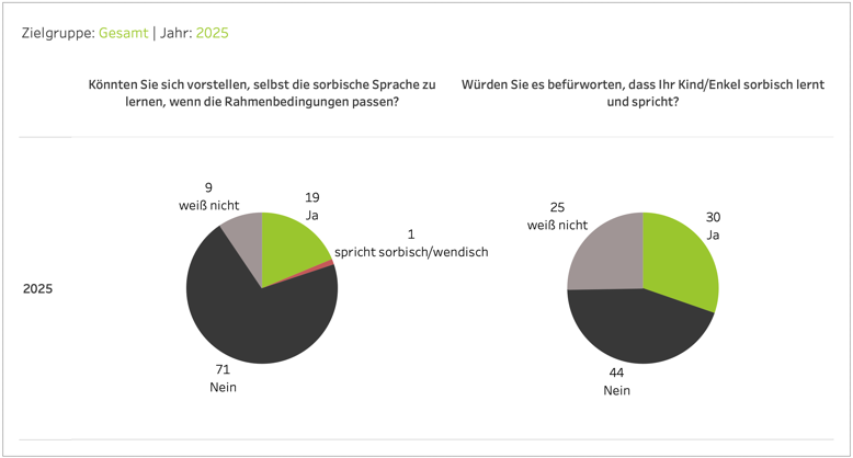 Etwa vier von zehn Lausitzern sprechen sich dafür aus, dass die Zweisprachigkeit im öffentlichen Raum weiter ausgebaut werden sollte (42 Prozent), und dass das Verstehen und Sprechen der sorbischen Sprache in der Lausitzer Bevölkerung gefördert werden sollte (44 Prozent).