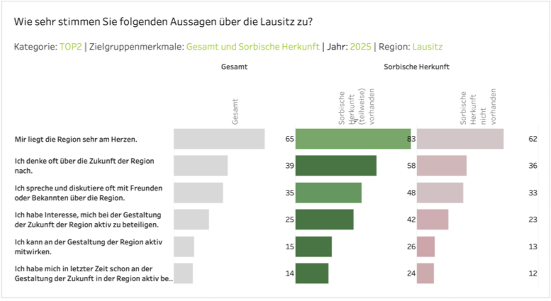 Der Unterschied zeigt sich zum Beispiel deutlich bei der Frage, ob einem die Region am Herzen liegt: 83 Prozent der Menschen mit einem sorbischen Hintergrund sagen von sich, dass ihnen die Region am Herzen liegt — gegenüber 62 Prozent derjenigen Lausitzer, die keinen sorbischen Hintergrund haben. Wie gesagt: die Unterschiede sind nicht „riesig“, aber „sehr deutlich“, was spätestens bei der Bindung an die Region deutlich wird.