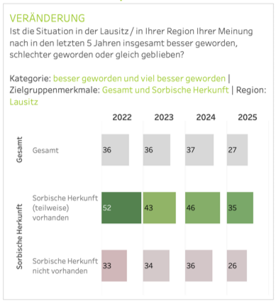 Im Jahr 2022 waren insgesamt 36 Prozent der in der Lausitz lebenden Menschen der Meinung, dass die Situation in der Region in den letzten fünf Jahren besser geworden sei. Unter denjenigen mit einem sorbischen Hintergrund lag dieser Anteil seinerzeit bei 52 Prozent, unter denjenigen ohne Bezug zum Sorbischen lag der Anteil damals nur bei 33 Prozent. Der Anteil ist zwischen 2022 und 2025 insgesamt zurückgegangen (von 36 auf 27 Prozent), allerdings ist der Anteil im Jahr 2025 unter den Menschen mit einem Bezug zum Sorbischen nach wie vor höher (35 Prozent) als unter Menschen ohne diesen Hintergrund (26 Prozent).