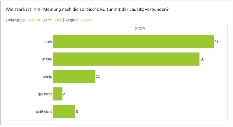 42 Prozent aller Lausitzer sehen eine „starke“, weitere 38 Prozent eine „mittlere“ Verbundenheit zwischen der sorbischen Kultur und der Lausitz. Eine geringe (11 Prozent) oder gar keine (2 Prozent) Verbindung sehen nur wenige Menschen; 6 Prozent wissen es nicht. Betrachtet man einzelne Zielgruppen genauer, so fällt auf, dass deutlich mehr jüngere Frauen hier eine Verbindung sehen als jüngere Männer. Bei den Frauen unter 40 beträgt der Anteil, der eine mittlere oder starke Verbindung sieht, 88 Prozent; bei den Herren der gleichen Altersgruppe liegt dieser Anteil nur bei 60 Prozent.