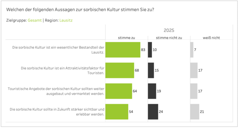 83 Prozent der Lausitzer Bevölkerung stimmen der Aussage zu, dass die sorbische Kultur ein „wesentlicher Bestandteil“ der Lausitz ist. Zwei Drittel der Lausitzerinnen und Lausitzer (68 Prozent) sehen in der sorbischen Kultur einen Attraktivitätsfaktor für Touristen und fast ebenso viele (64 Prozent) meinen, dass entsprechende touristische Angebote der sorbischen Kultur weiter ausgebaut werden sollten. Etwas mehr als die Hälfte der Lausitzer Bevölkerung (54 Prozent) stimmt der Aussage zu, dass die sorbische Kultur in Zukunft stärker sichtbar und erlebbar werden sollte.