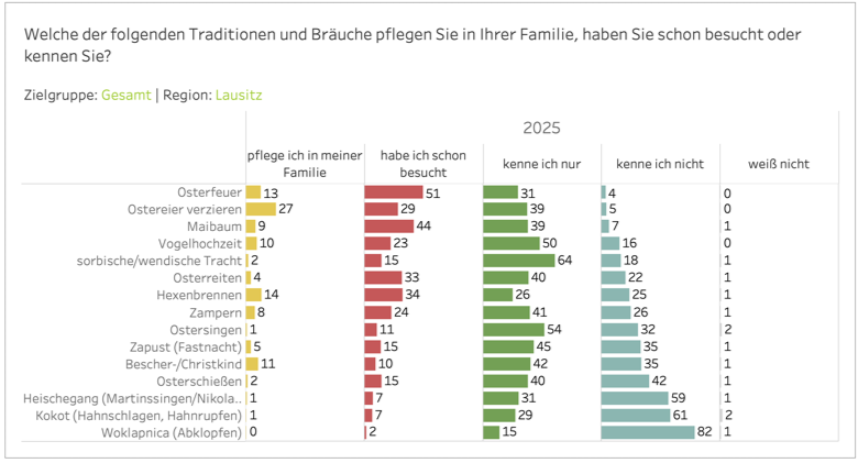 Bei der Frage, welche Traditionen oder Bräuche man ggf. schon gesehen oder auf Veranstaltungen besucht hat, sind Osterfeuer, Maibaum, Hexenbrennen und Osterreiten die am häufigsten genannten. Ein Blick auf die unten stehende Abbildung zeigt zudem, dass der Anteil der Menschen, die Traditionen und Bräuche auf besuchten Veranstaltungen sehen, bei den meisten Bräuchen viel höher ist als die aktive Pflege. Zumal wird deutlich, dass manche Traditionen sehr bekannt sind, obwohl nur ein sehr kleiner Teil der Bevölkerung die betreffende Tradition aktiv pflegt. Das beste Beispiel hierfür sind die Trachten: Zwei Drittel der Bevölkerung kennen sorbische Trachten, aber nur zwei Prozent der Bevölkerung pflegen diese Tradition aktiv.